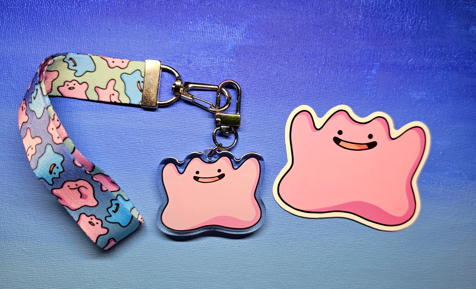- Attached is a double-sided Ditto charm with an epoxy dome on each side, one featuring normal Ditto and the other being shiny.
