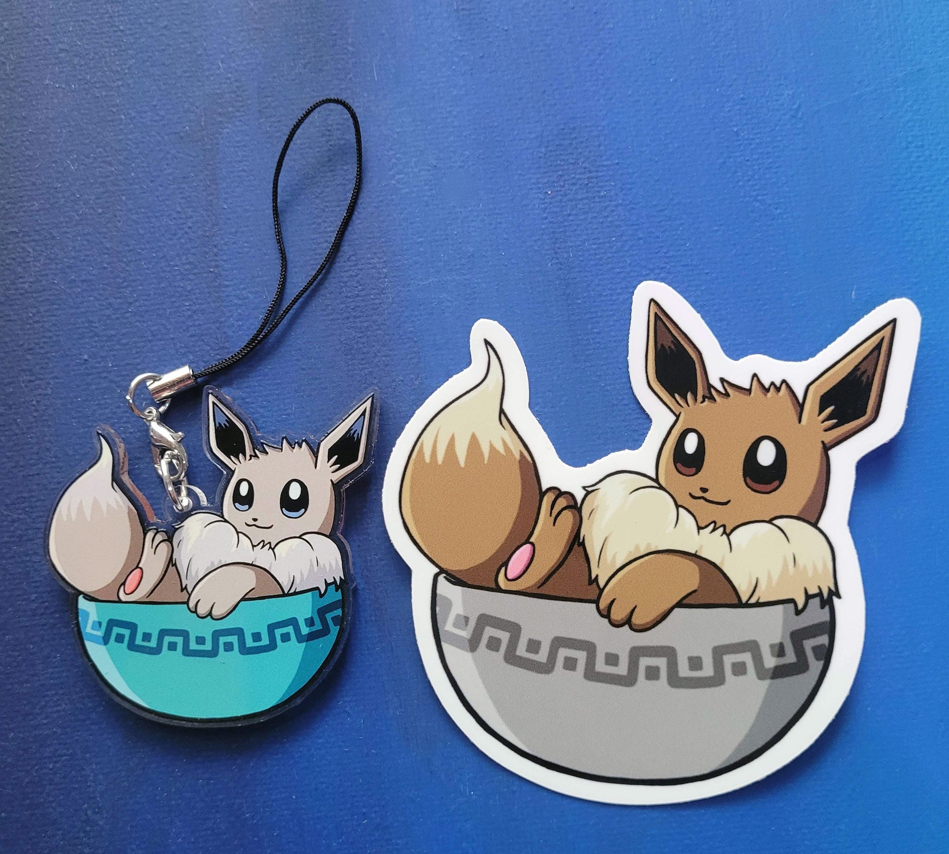 - An adorable bowl-abiding 2" Eevee charm, mirrored with a shiny variant on the backside