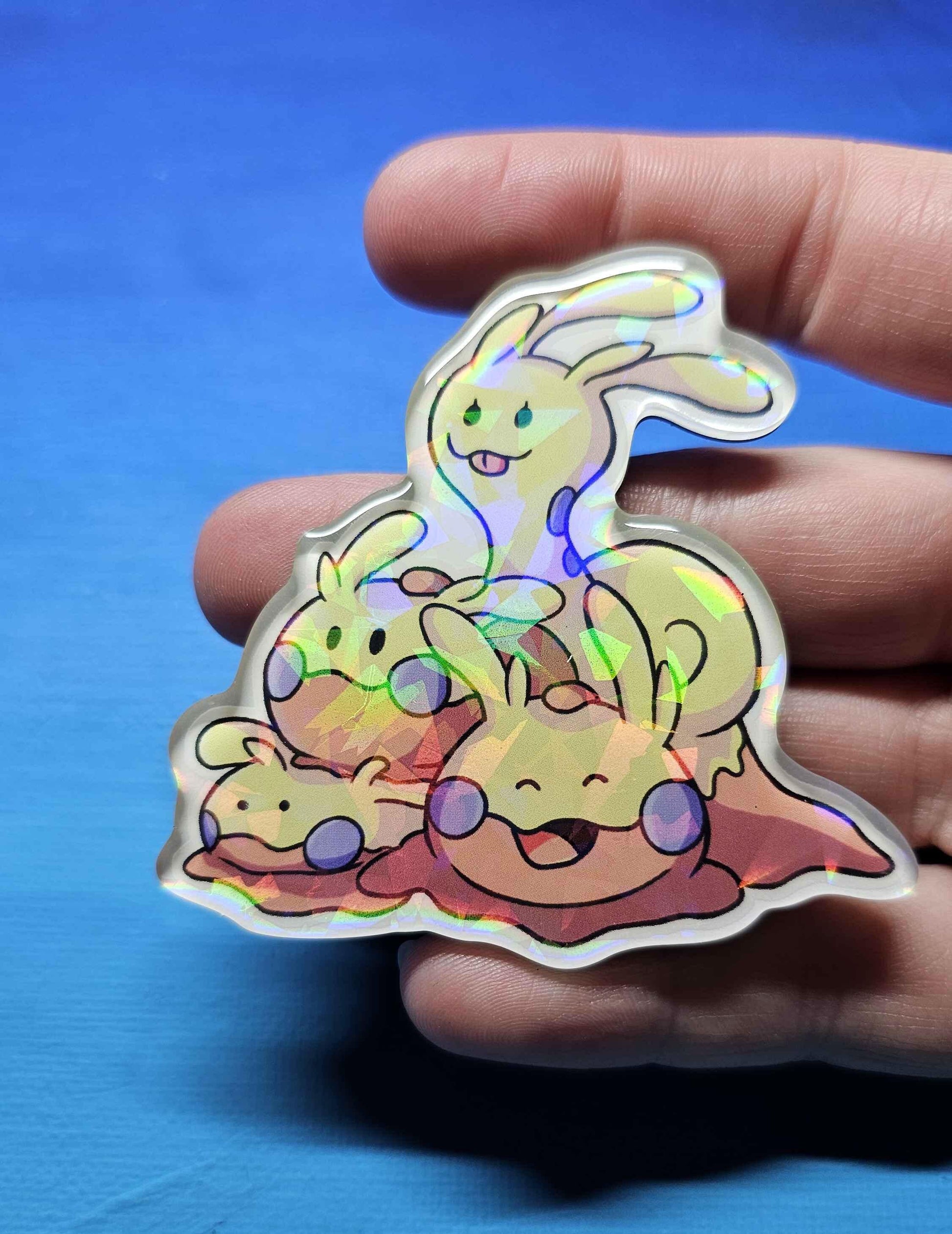 - A lovely golden pile of goo 2.5" Shiny Goomy + Sliggoo magnet, printed on acrylic with a full magnetic backing
