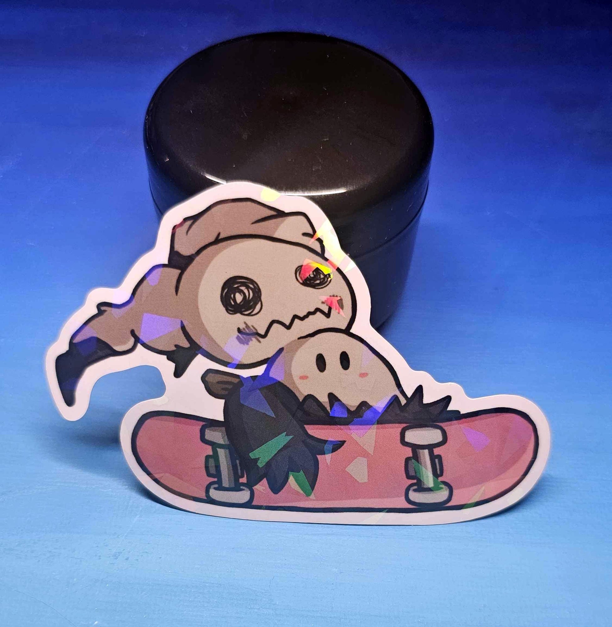 - The rad Pokemon skater, Shiny Mimikyu, doing an airgrab with their skateboard, as a 3" sticker w/ a "broken glass" holo finish!
