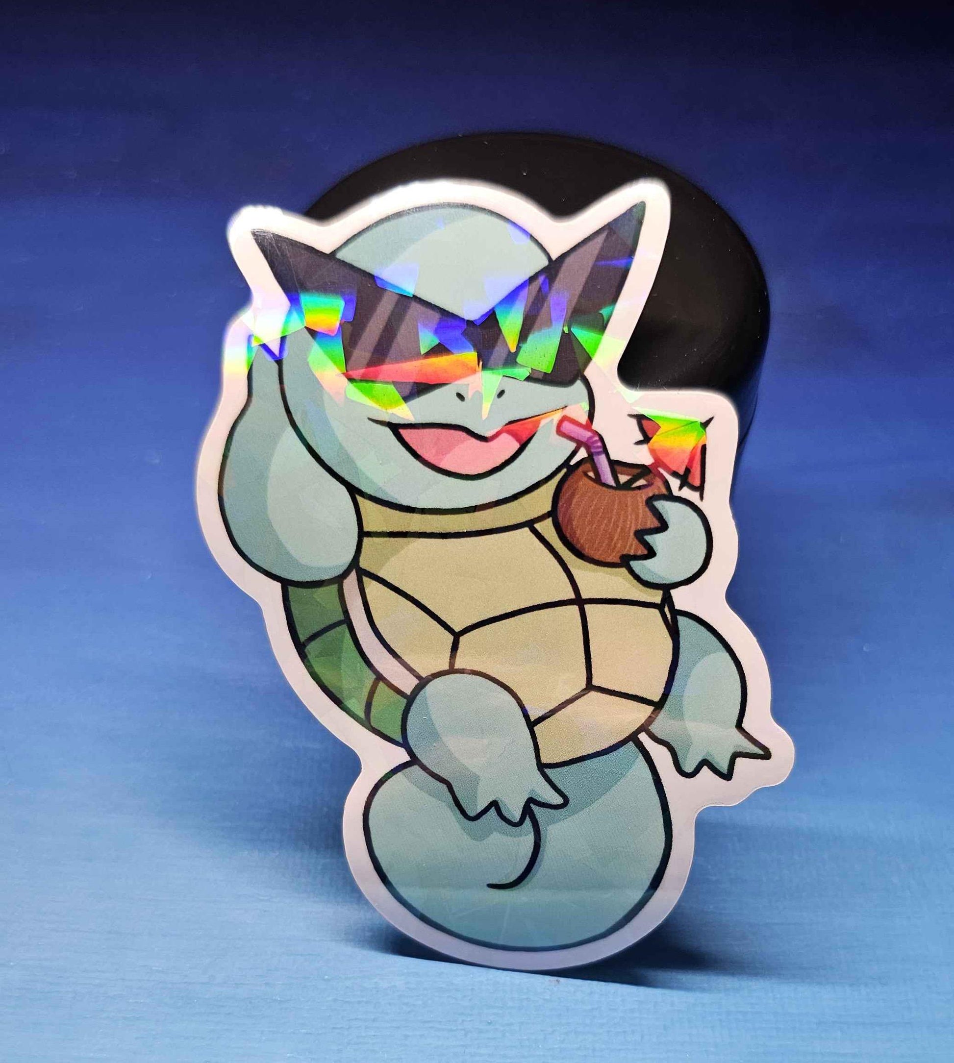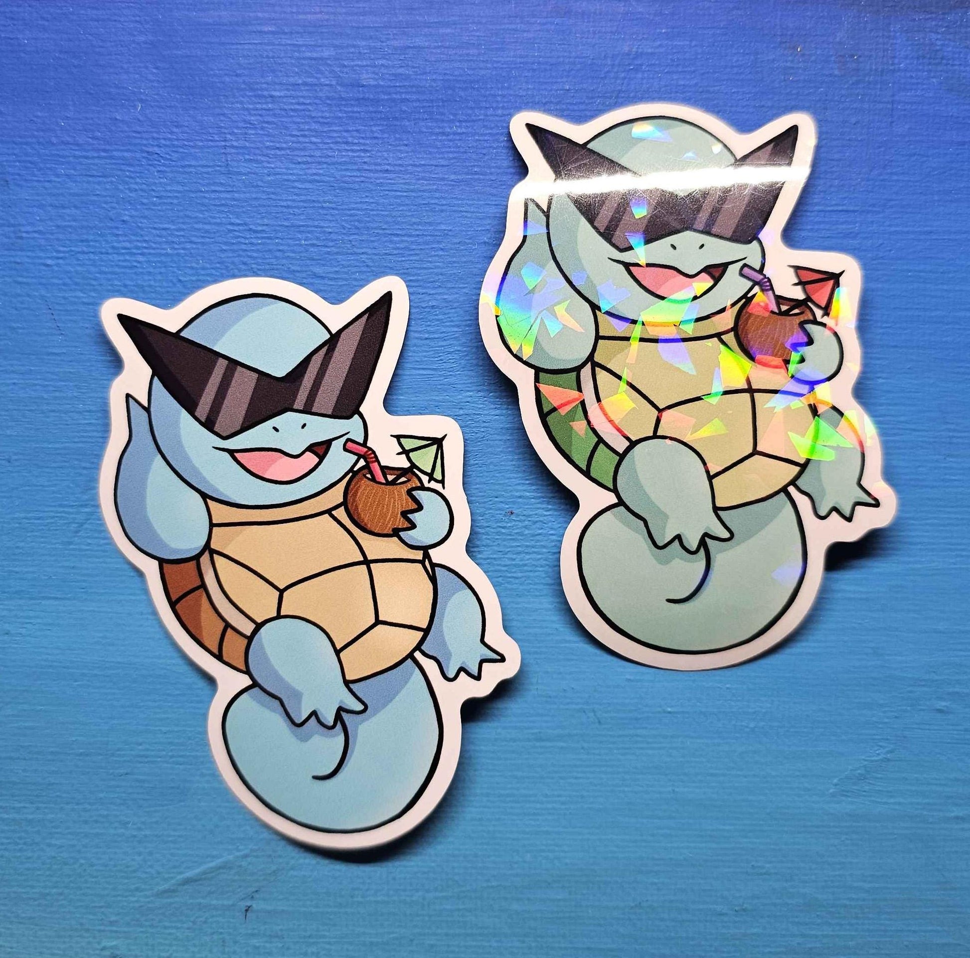 - The coolest turtle around, Shiny Squirtle, enjoying a drink from a coconut as a 3" sticker!