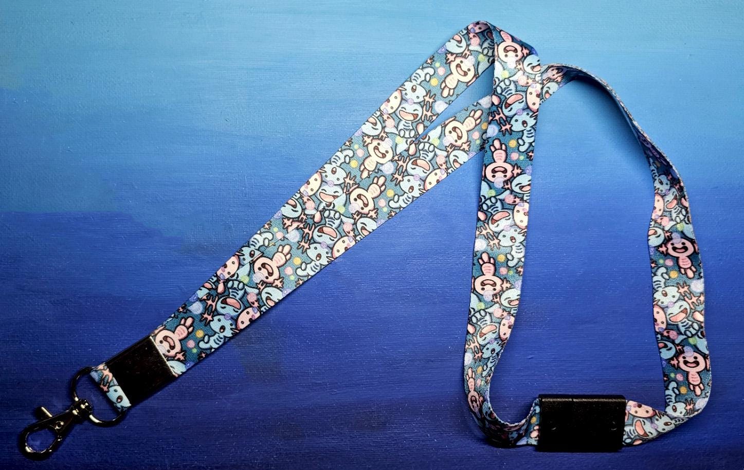 - 2cm wide lanyard that measures 90cm/35in length, comes with a safety break on the top end, and a metal clip closure + lobster clasp on the bottom.